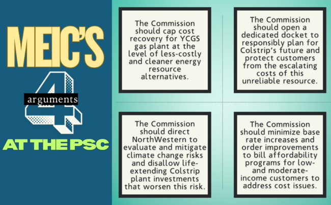 So what’s at stake in this rate case? The most important issues for MEIC center around cost recovery for the YCGS gas plant, future treatment of the Colstrip coal plant, NorthWestern and the PSC’s consideration of climate change risks in infrastructure investments, and the affordability impacts of any rate increase. Specifically, we have advocated for the PSC to disallow substantial costs for YCGS (if cost recovery is allowed at all) related to cost overruns, facility units that have not come online, inflated annual operating projections, the lower cost of renewable energy alternatives, and the climate costs that NorthWestern has ignored.