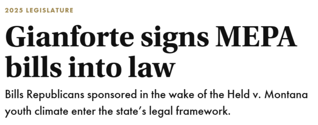But they didn’t stop there. Republicans have argued for years that the state cannot deny a permit under MEPA; it can only do so when issuing permits under substantive statutes like the Clean Air Act. In a preemptive move, the Legislature passed HB 291 (Rep. Greg Oblander, R-Shepard). HB 291 prevents the state from adopting any regulation for greenhouse gases that was not adopted first by the federal government. The result is that the state cannot mitigate or limit greenhouse gas emissions.