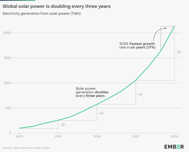Solar power is growing faster than any energy source in history. It took about eight years for solar energy to go from 110 terrawatt hours (TWhrs) to 1000 TWhrs, and it only took three years to go from 1000 TWhrs to 2000 TWhrs, growing 29% in 2024 alone. Wind in the second fastest-growing generation.
