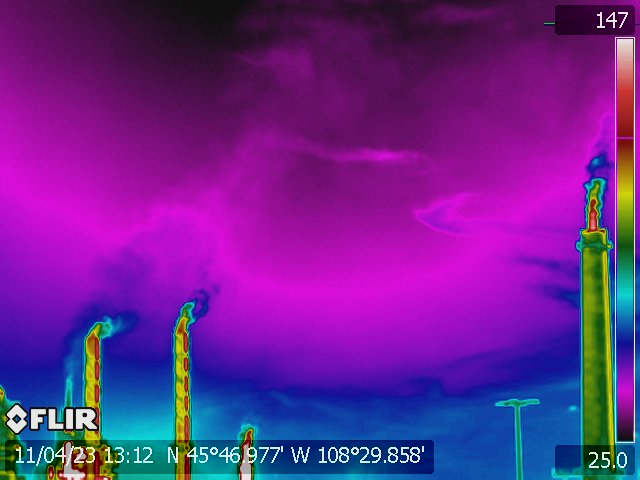 The Forward Looking InfraRed (FLIR) camera uses technology capable of detecting volatile organic compounds (VOCs), including known carcinogens such as benzene, and greenhouse gases such as methane. This camera was specially attuned to methane and similar VOCs, explicitly excluding visual capture of CO2 emissions. The FLIR camera captures the unique signature of VOC infrared radiation to identify emissions from incomplete flaring, gas leaks on pipelines and storage tanks, routine oil and gas processing operations, faulty equipment, accidents, and intentional releases by operators. Earthworks’ FLIR camera is specially equipped with a telephoto lens that documents this pollution that is otherwise invisible to the human eye.