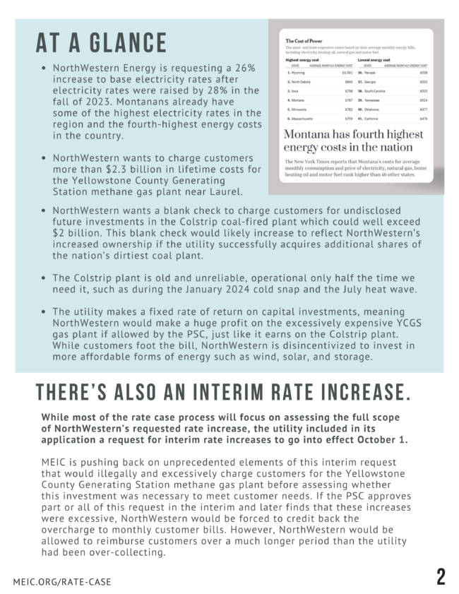Reducing our dependence on fossil fuels through an equitable transition to renewable and clean energy sources. Campaign areas include NorthWestern Energy accountability, development of clean and affordable energy, promotion of energy efficiency, and fighting coal, oil, and gas development and use in Montana.